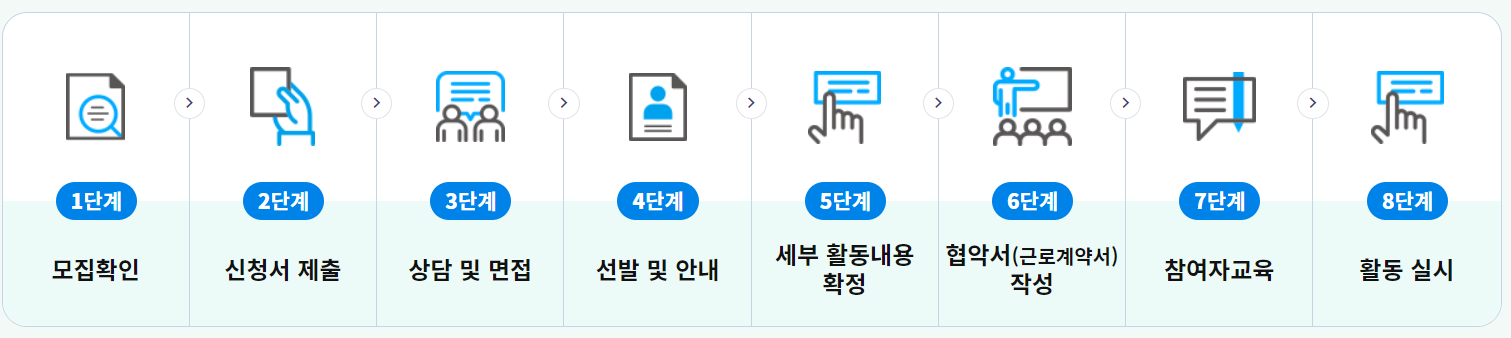 - 근무내용 : 교육시설 학습보조, 시니어 컨설턴트, 취약계층 공익증진 서비스, 노인맞춤 돌봄 서비스 등