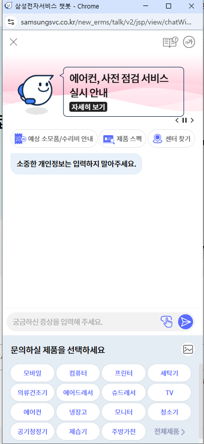 삼성전자 서비스 홈페이지 우측 하단 챗봇에서 '에어컨 사전점검'을 입력한 후 예약